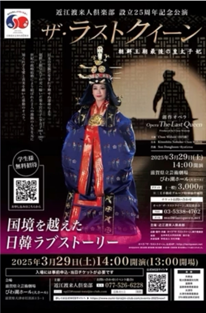 뮤지컬 Opera "The Last Queen"은 대한제국 마지막 황태자비 이방자 여사의 삶을 조명하는 창작 오페라이다. 단순한 역사적 사건의 나열을 넘어서, 한 여성이 일본 귀족으로 태어나 한국의 황실에 입궁하고, 전쟁과 정치, 문화적 충돌 속에서 어떤 선택을 했는지를 예술적으로 탐색한다. 이 작품은 이방자 여사의 삶을 통해 한일 근현대사의 복잡한 교차점을 풀어내며, 관객들에게 시대적 사명감과 개인적 고뇌, 그리고 궁극적인 인간애에 대한 메시지를 전한다. 공연은 2025년 3월 30일, 일본 시가현 히코네 문화플라자에서 개최될 예정이다.